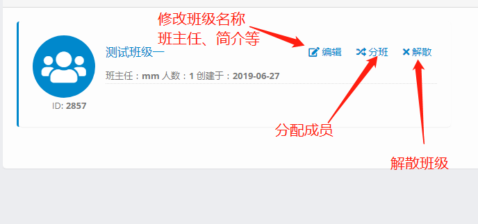 找到对应的班级,点击【编辑】可以修改班级名称、班主任、简介、班级图片。点击【解散】删除班级。