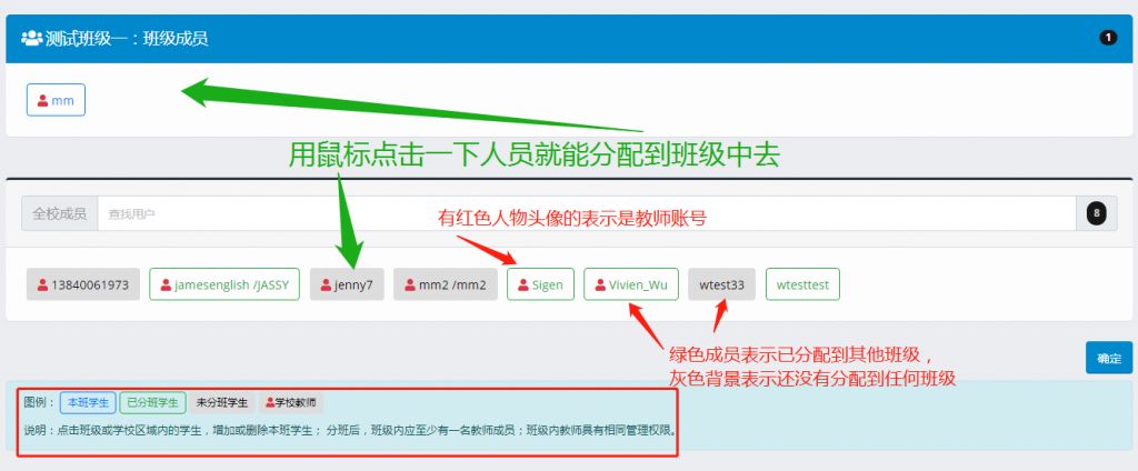 在搜索栏下方需要加入班级的人员上用鼠标点击一下就能分配到班级中去,下方有图例说明。