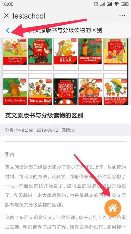 第二:老师通过微信分享APP首页的一页文章,打开文章链接,点击左上角返回按钮或者右下角的返回主页按钮。