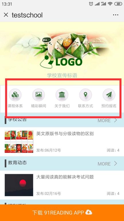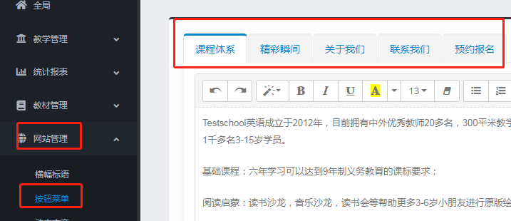 在APP管理后台网站(91reading.com/schoolmaster)的【网站管理】→【按钮菜单】里面可以设置【课程体系】、【精彩瞬间】、【关于我们】、【联系我们】、【预约报名】相关信息